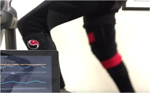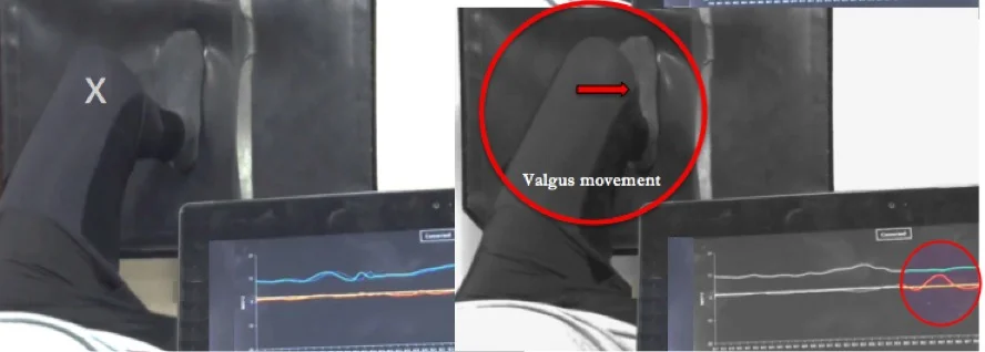 Applying a tensile force to the knee joint in a way that encourages movement towards a Valgus Event. The Wearer is prompted to make adjustments to ensure healthy biomechanical alignment over the course of the exercise movement (ie Single Leg Press). Any Valgus Movements are identified live time on a tablet to visualize their occurence and strength, measured in Newtons.